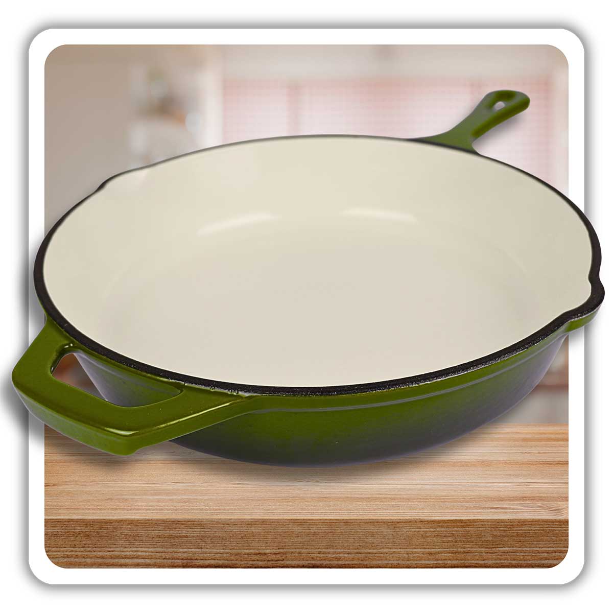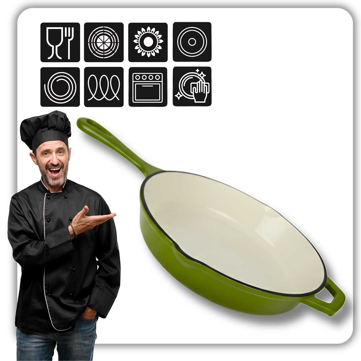 Odkryj trwałą patelnię żeliwną 26 cm w eleganckim oliwkowym kolorze. Żeliwo doskonale rozprowadza i utrzymuje ciepło, gwarantując perfekcyjne rezultaty smażenia, duszenia i zapiekania. Emaliowana powłoka chroni przed korozją i jest wyjątkowo łatwa w czyszczeniu. Używaj jej na wszystkich kuchenkach, w tym indukcyjnych, oraz bezpiecznie w piekarniku.
