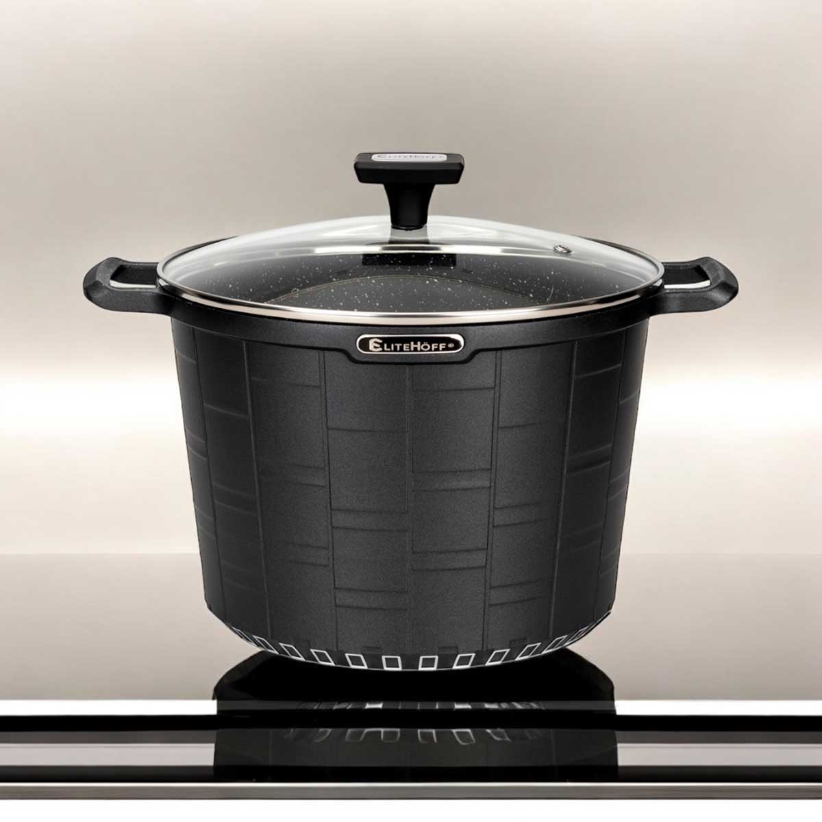 - Materiał: Garnek wykonany jest z odlewu aluminiowego, który zapewnia równomierne rozprowadzanie ciepła, dzięki czemu potrawy gotują się szybciej i bardziej równomiernie. Granitowa powłoka jest odporna na zarysowania i uszkodzenia mechaniczne.