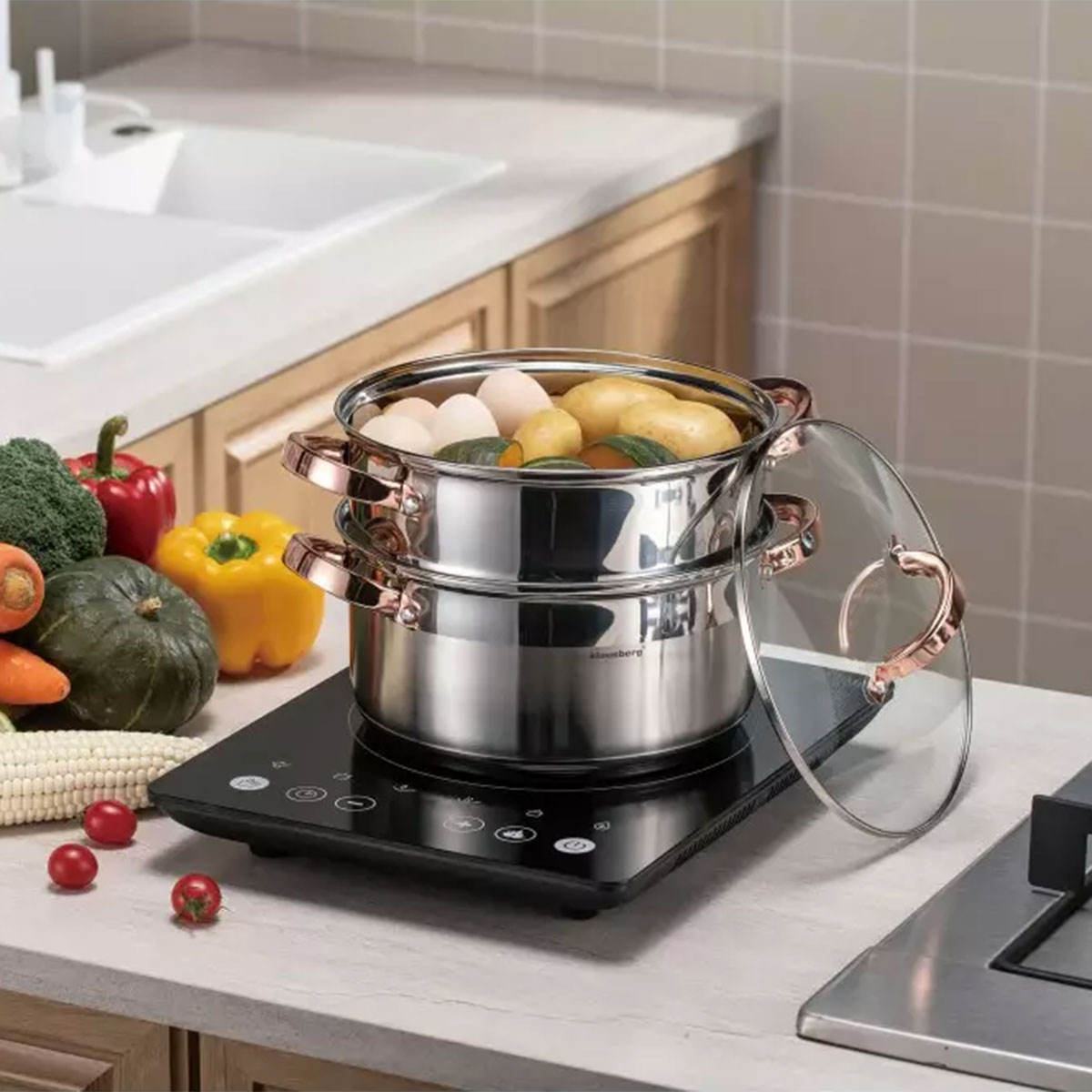 Komplet garnków do gotowania na parze wykonany jest z wysokiej jakości stali nierdzewnej. Wykorzystana stal składa się z najlepszej jakości stopu powszechnie stosowanego w światowej klasy produktach, co gwarantuje jej wysoką odporność na korozję oraz bardzo dobrą wytrzymałość. Zastosowany materiał umożliwia szybkie podgrzanie potraw i przez dłuższy czas utrzymuje ciepło. Produkt przystosowany do gotowania na kuchenkach indukcyjnych, gazowych, elektrycznych, ceramicznych i halogenowych. Można go bezpiecznie myć w zmywarkach.