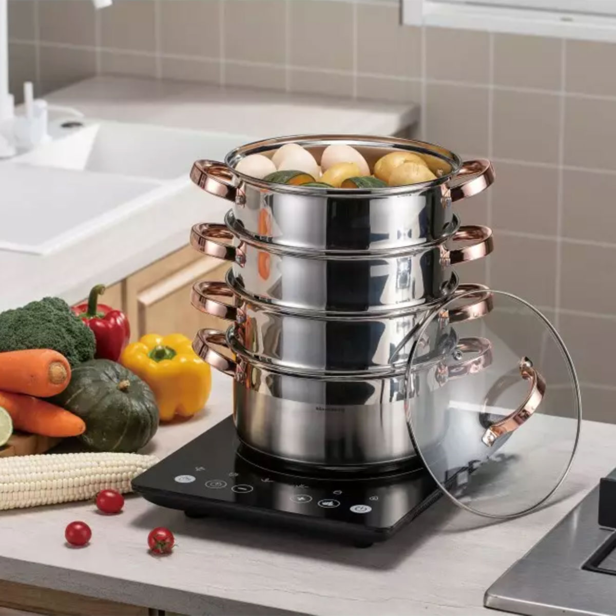 Trzy wkłady pozwalają na jednoczesne przygotowanie 3 odseparowanych od siebie potraw lub przygotowanie potrójnej porcji jednej potrawy.