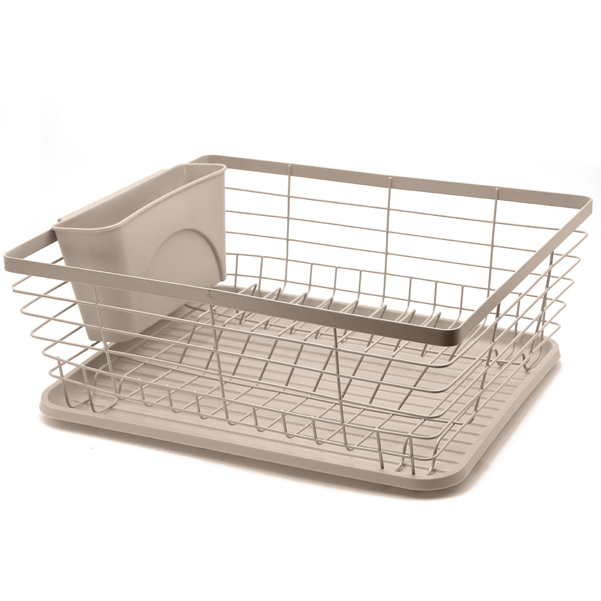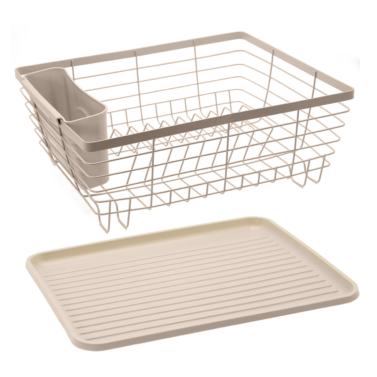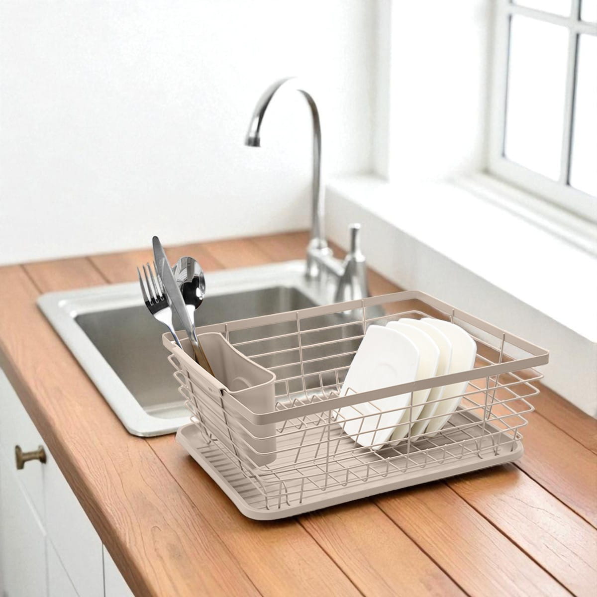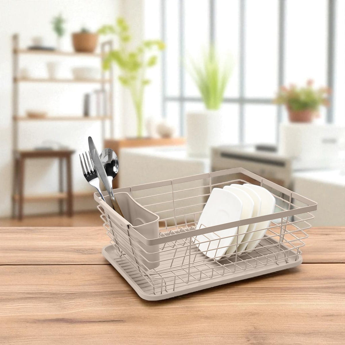 Stylowa i funkcjonalna suszarka do naczyń w eleganckim, beżowym kolorze to idealne rozwiązanie do każdej kuchni. Jednopoziomowa konstrukcja pozwala na wygodne suszenie talerzy, kubków i misek, a praktyczny ociekacz na sztućce pomaga utrzymać porządek na blacie.
