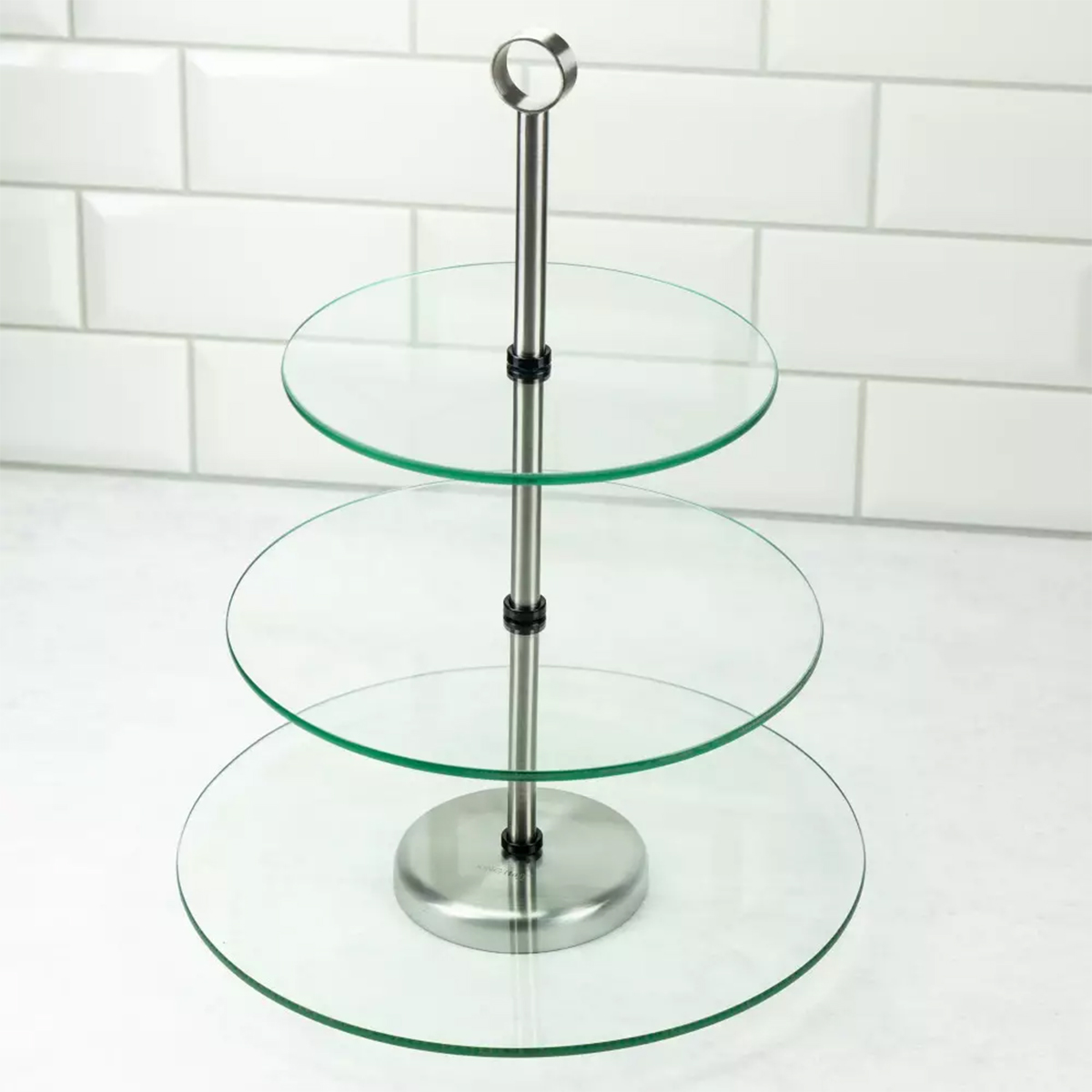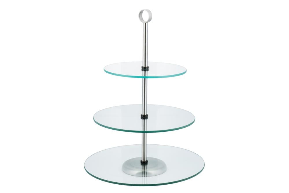 Okrągła, trójpoziomowa patera została wykonana ze szkła i stali nierdzewnej. Dzięki klasycznemu kształtowi pasuje się do każdej jadalni. Jest trzypoziomowa, dlatego możesz oszczędzić miejsce na stole. Dodatkowo dzięki uchwytowi można wygodnie przeniesiesz ją z miejsca na miejsce, także wraz z zawartością.