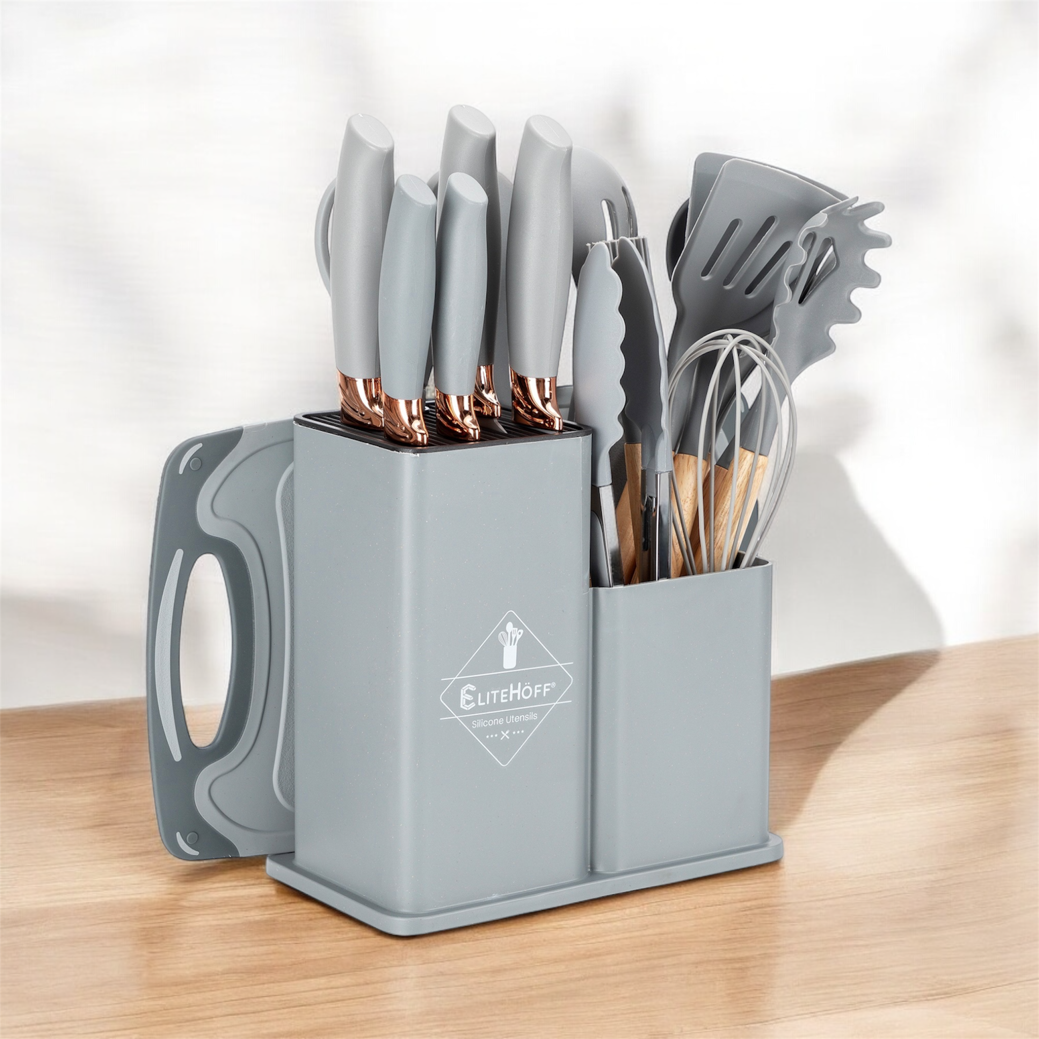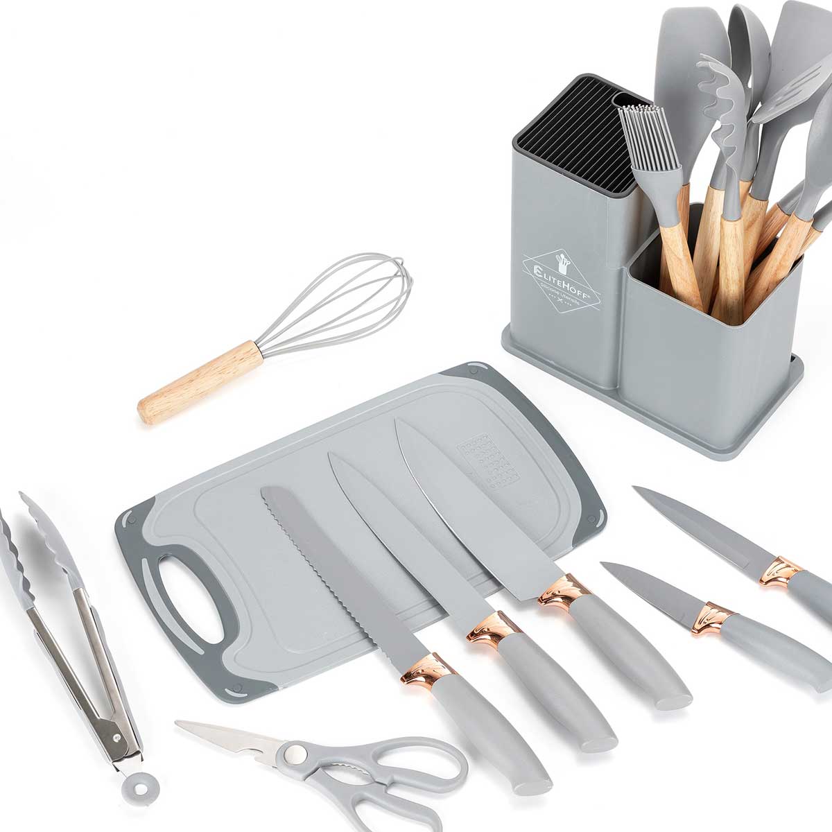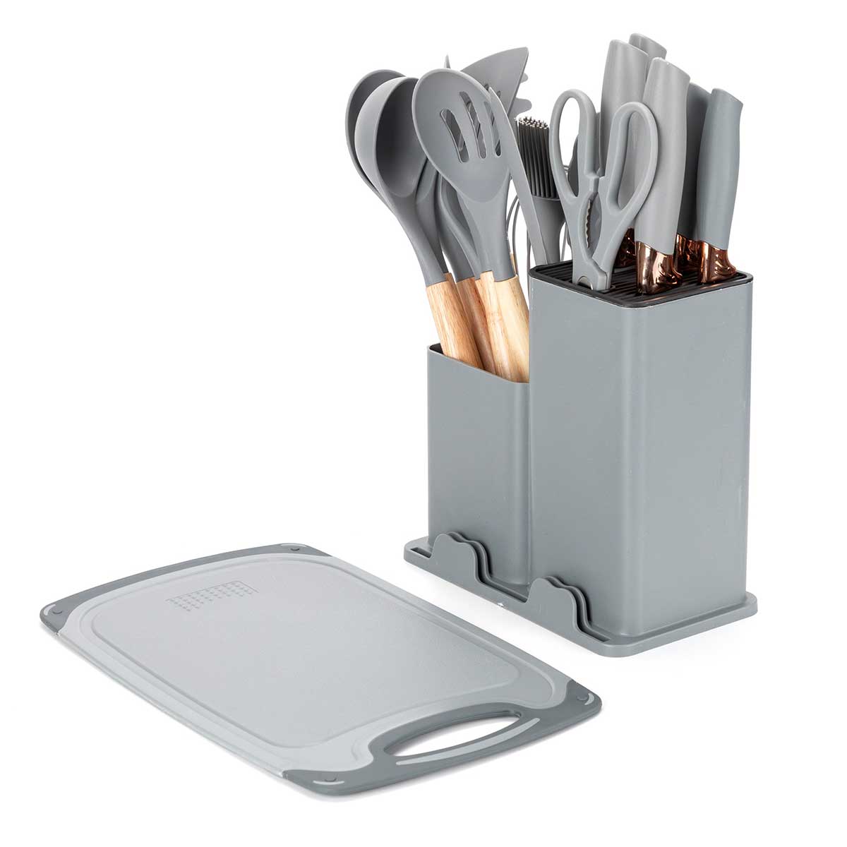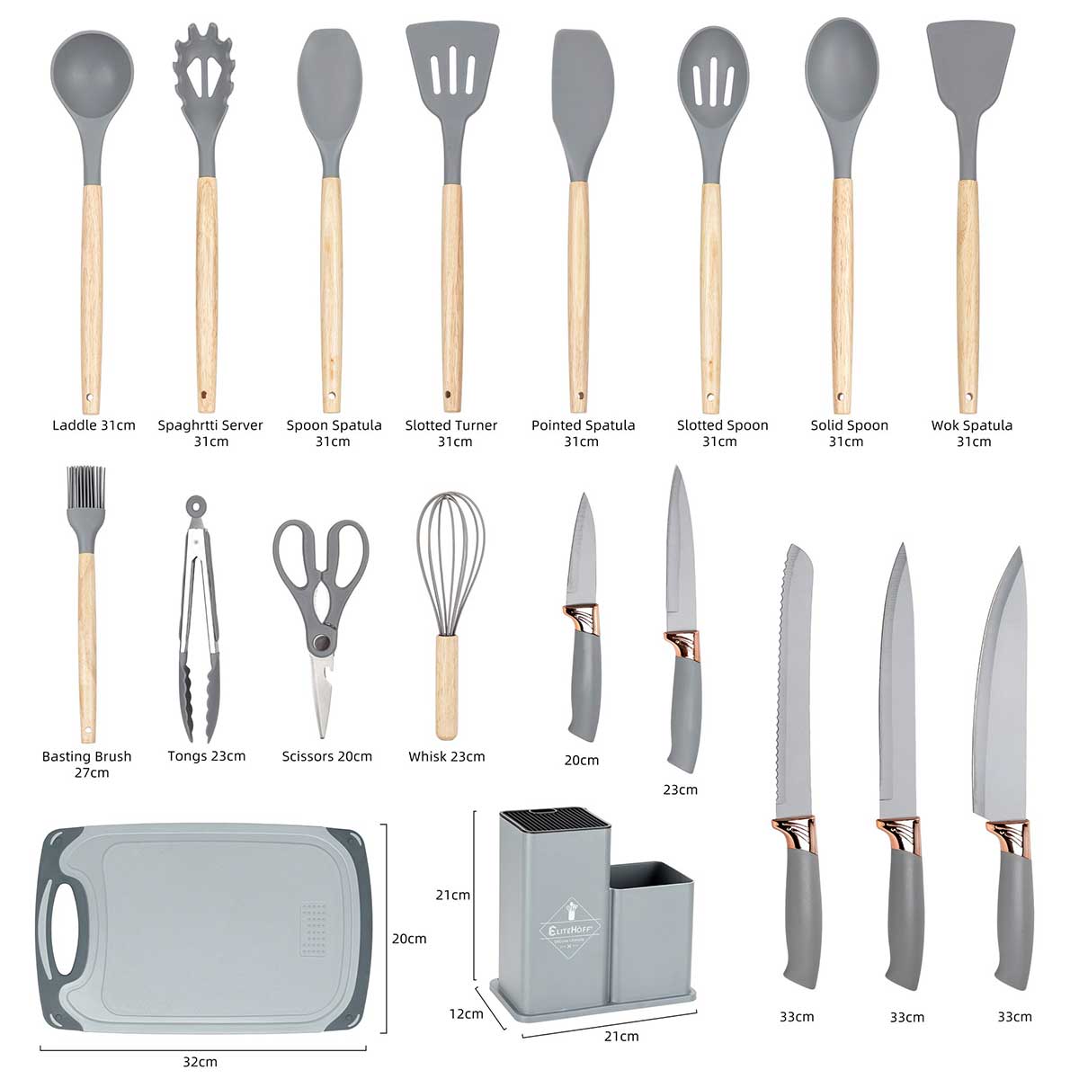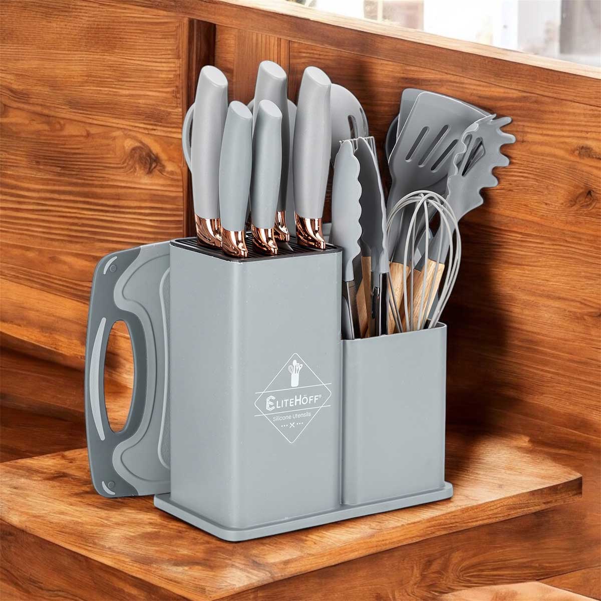 Zestaw 19-elementowy noży kuchennych oraz przyborów wraz z deską do krojenia w stojaku to kompletny i elegancki zestaw do każdej kuchni, który ułatwia codzienne przygotowywanie posiłków. Zestaw zawiera różnorodne noże do różnych zadań kuchennych – od krojenia chleba, przez porcjowanie mięsa, po siekanie warzyw, a także deskę do krojenia, zestaw łyżek i szpatuł, pędzelek silikonowy, ubijaczkę, szczypce, nożyce, które zwiększają jego funkcjonalność. Zestaw przyborów kuchennych wykonanych z drewna kauczukowego i nylonu termoplastycznego. Przybory dedykowane do naczyń z powłokami teflonowymi i ceramicznymi wrażliwymi na zarysowania. Część nylonowa odporna na temperaturę do 200°C
