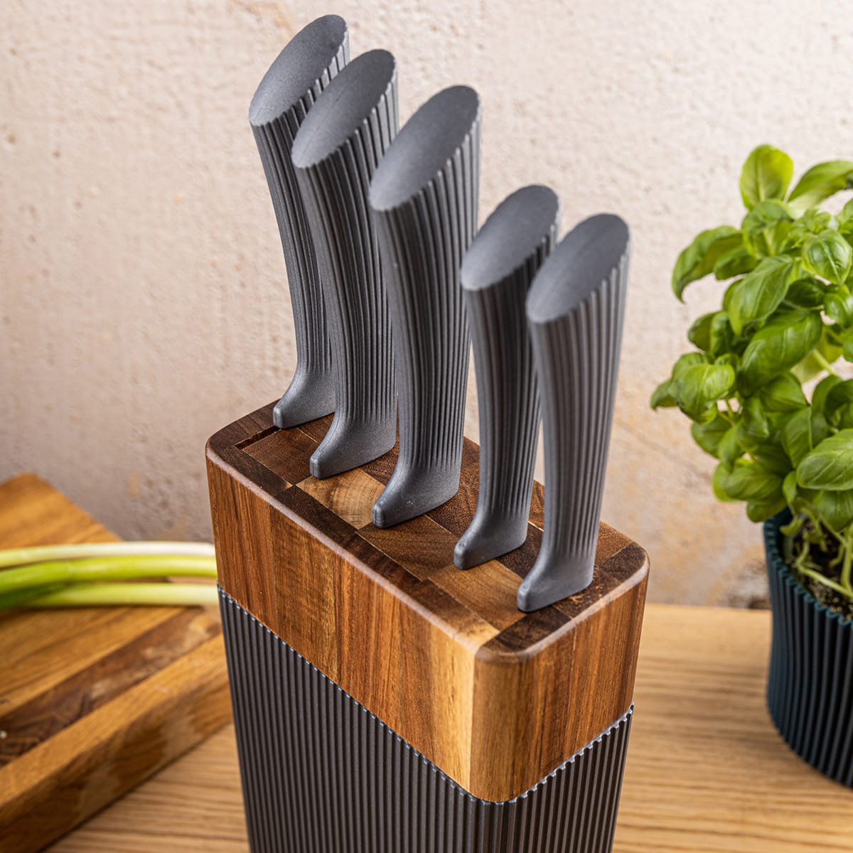 Elegancja, porządek i ostrość w codziennej kuchni — KLAUSBERG KB-7979 to 6-elementowy zestaw, w którym znajdziesz 5 kluczowych noży oraz stabilny blok z górą z drewna akacjowego i żebrowanym korpusem w odcieniu grafitowej szarości. Ostrza ze stali nierdzewnej gwarantują trwałość i precyzję, a ryflowane, ergonomiczne uchwyty zapewniają pewny chwyt i komfort podczas pracy. Nowoczesne, stonowane wzornictwo pasuje do każdej kuchni – zarówno klasycznej, jak i współczesnej.
