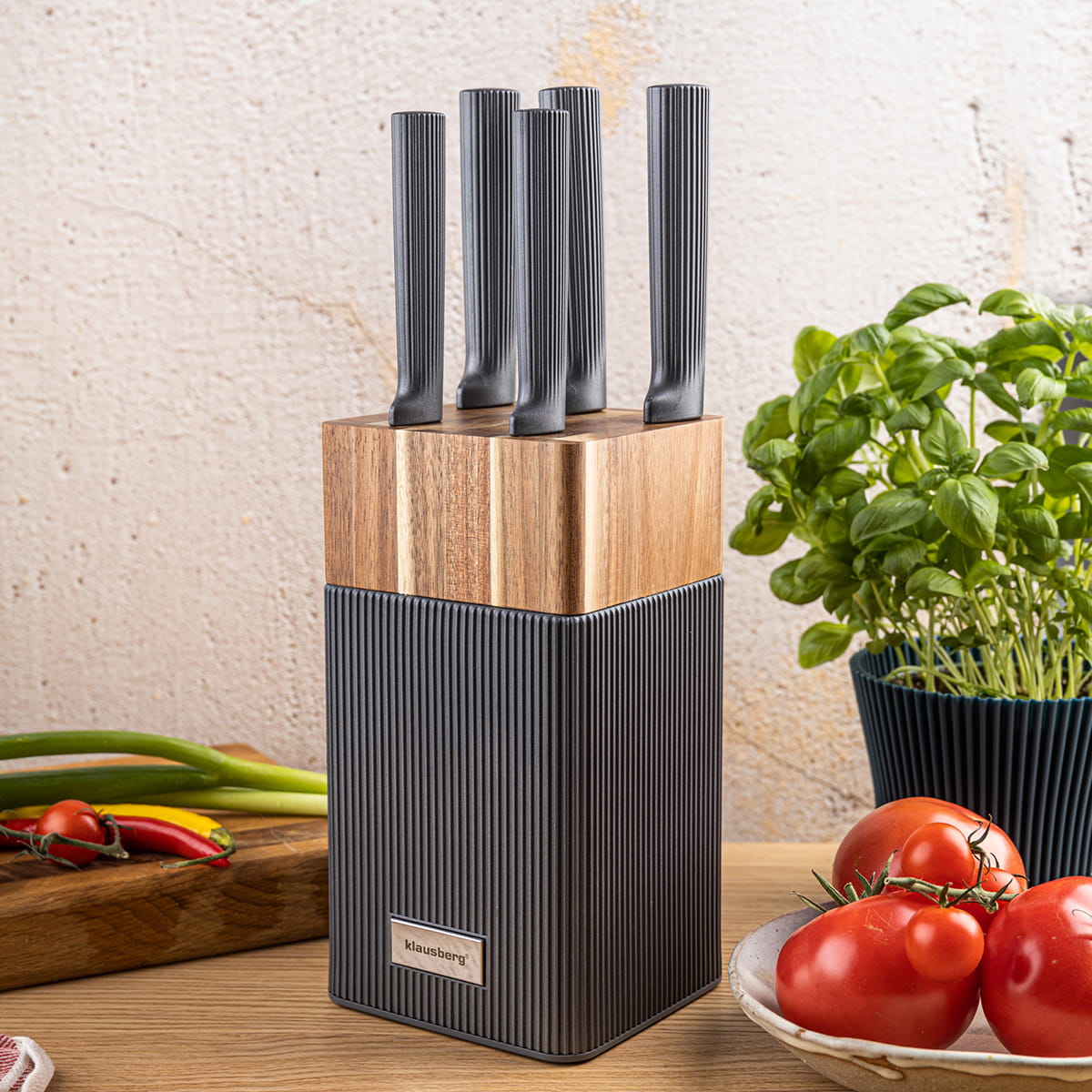 Nowoczesny minimalizm i wygoda krojenia na co dzień — KLAUSBERG KB-7982 to elegancki zestaw 6-elementowy, który łączy 5 najpotrzebniejszych noży ze stali nierdzewnej ze stabilnym blokiem z elementami drewna akacjowego. Żebrowane, grafitowe uchwyty gwarantują pewny chwyt, a naturalne drewno nadaje całości ponadczasowego stylu. Idealny zestaw do kuchni nowoczesnych, klasycznych i loftowych.